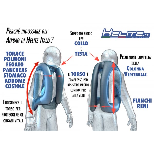- Zone protette dal sistema airbag torace collo e zona cervicale fianchi e tutta la colonna vertebrale