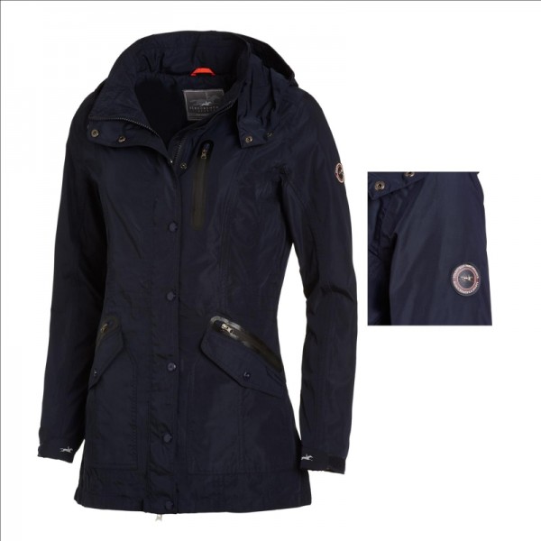 Parka donna Dianne Style Ocean Shockemohlem con cuciture nastrate,con molte tasche pratiche Schockemohle Sport logo sulla manica con cappuccio,polsino regolabile,taglio sagomato, impermeabile traspirante con piccole prese di ventilazione sotto le braccia.