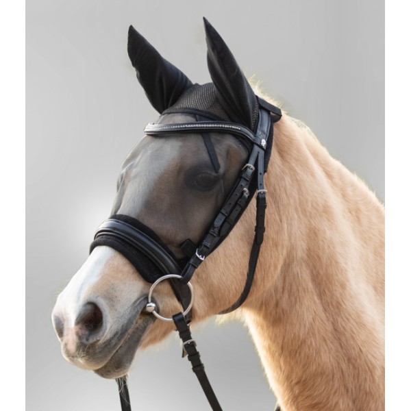 In corrispondenza della capezzina, la maschera rimane morbida e libera di muoversi grazie a un inserto elastico. Ideale per coloro che vogliono liberarsi di fastidiosi insetti durante il lavoro a cavallo.