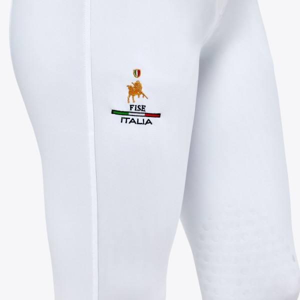 Il grip trasparente all'altezza del ginocchio permette un'ottima stabilità sul cavallo, mentre i calzini elastici decorati con logo vestono comodamente sotto gli stivali. I pantaloni sono rifiniti da logo tricolore.