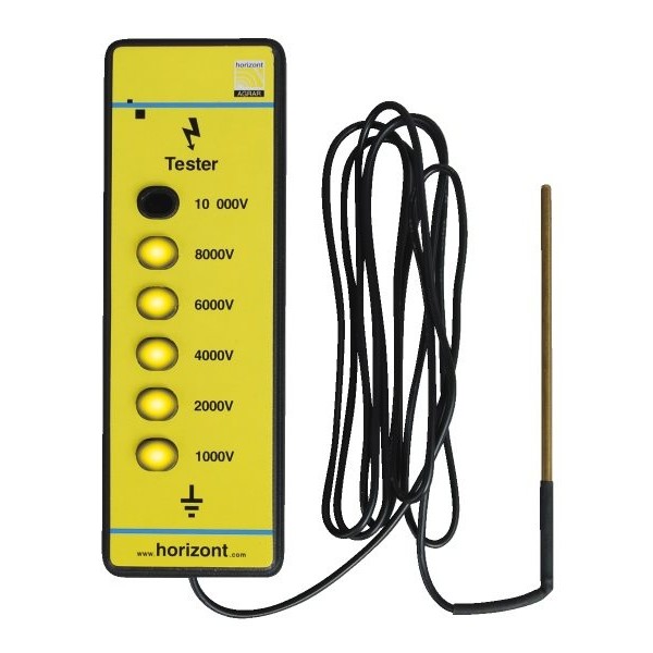 Tester Horizont è un indicatore di tensione pratico e veloce a 6 stadi funziona senza picchetto per la messa a terra.La misurazione avviene appoggiando l'apparecchio sul meteriale del recinto e premendo il pulsante di controllo.