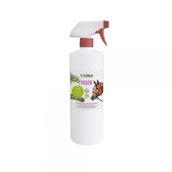 Disor Unika è un prodotto profumante a base di oli essenziali di citronella,geranio,tea tree e olio di neem.Disor è una prodotto per uso esterno.Spruzzare un leggere quantitativo di prodotto su manto,criniera,coda,collo,garrese,fianchi e ventre.Fornito di spruzzino.Conf. 1 lit.