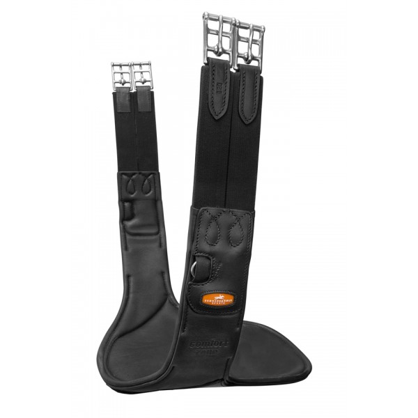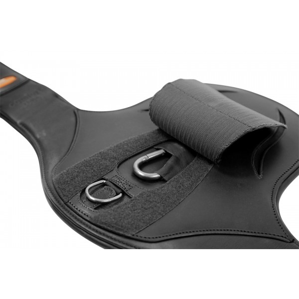 OKLAHOMA stud protection girth from SCHOCKEMOHLE sets new standards for this. Anatomically shaped, the girth is particularly flat in the elbow area. At the same time, in the area of the chest, the wider centre plate with multi-layer soft foam ensures even better pressure distribution. It is made of firmer leather and thus also protects against blows. The large carabiner makes it easier for the rider to buckle in the breastplate. Once fastened, the cover with the large leather flap prevents the horse from dangerously stepping into a breastplate, for example. The tripple-fold elastic on both sides and the softly padded roller buckles take comfort for the horse to a new level.